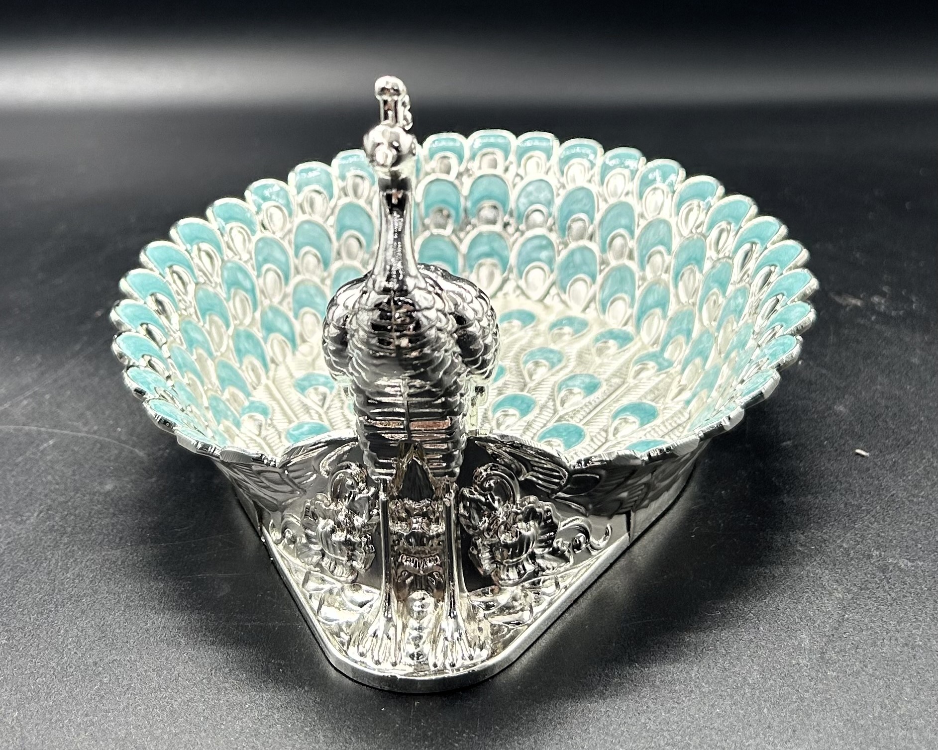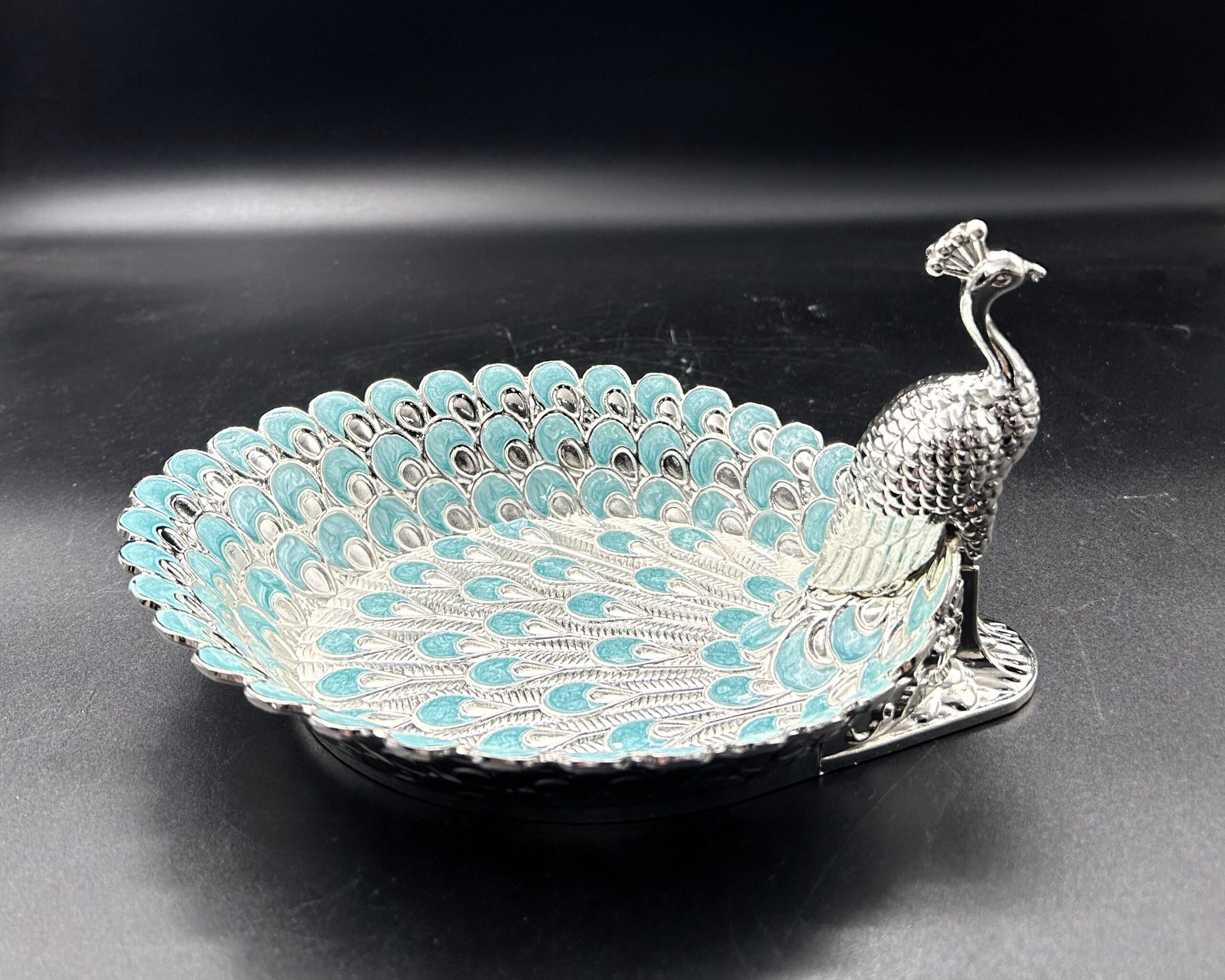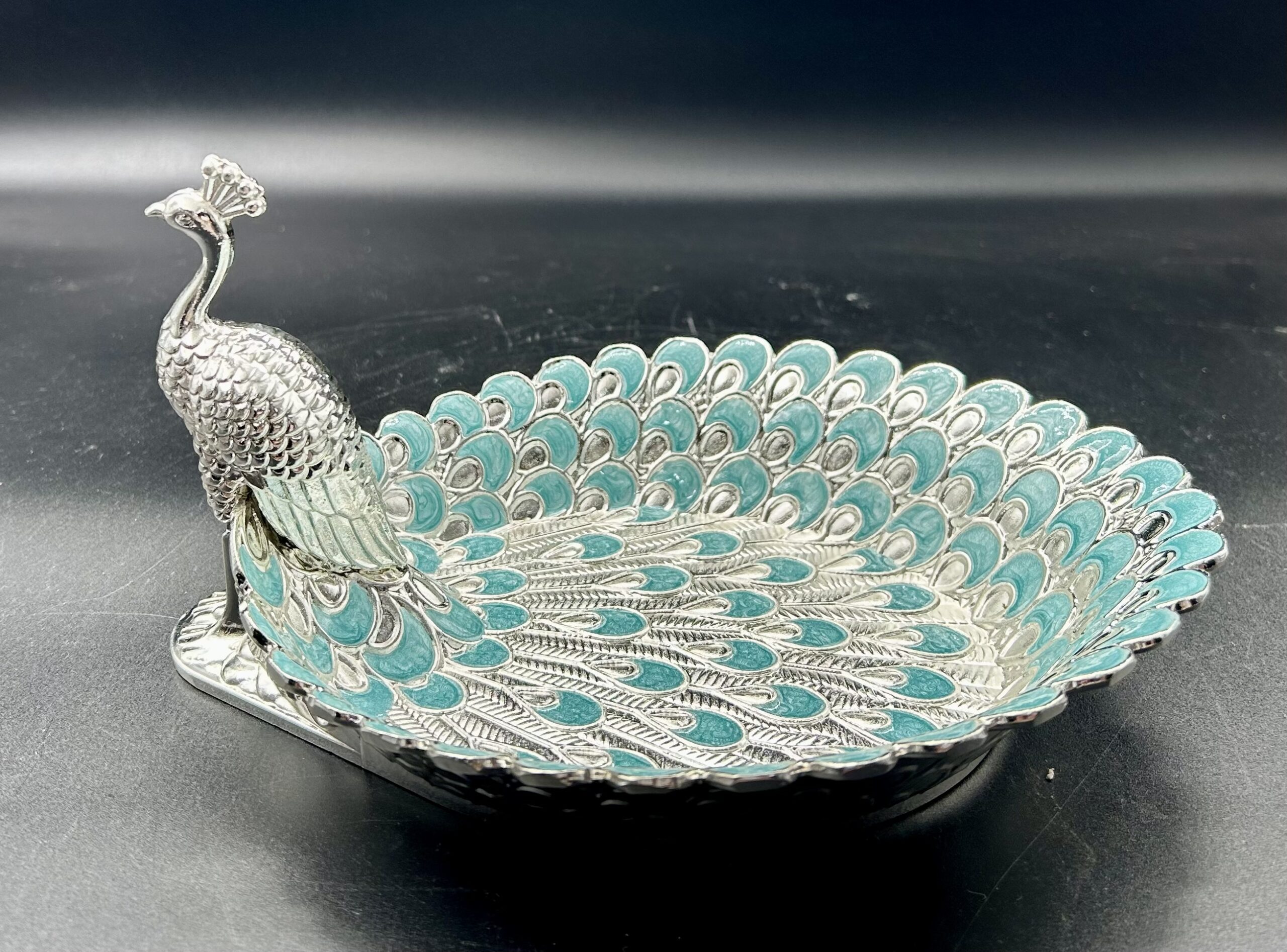 “Elevate every occasion with our stunning silver‑plated peacock platter. Handcrafted to capture the iridescent beauty of peacock feathers, this piece doubles as a luxurious server and a statement décor accent that adds regal charm to any table or display. Durable, polished, and crafted to impress.”