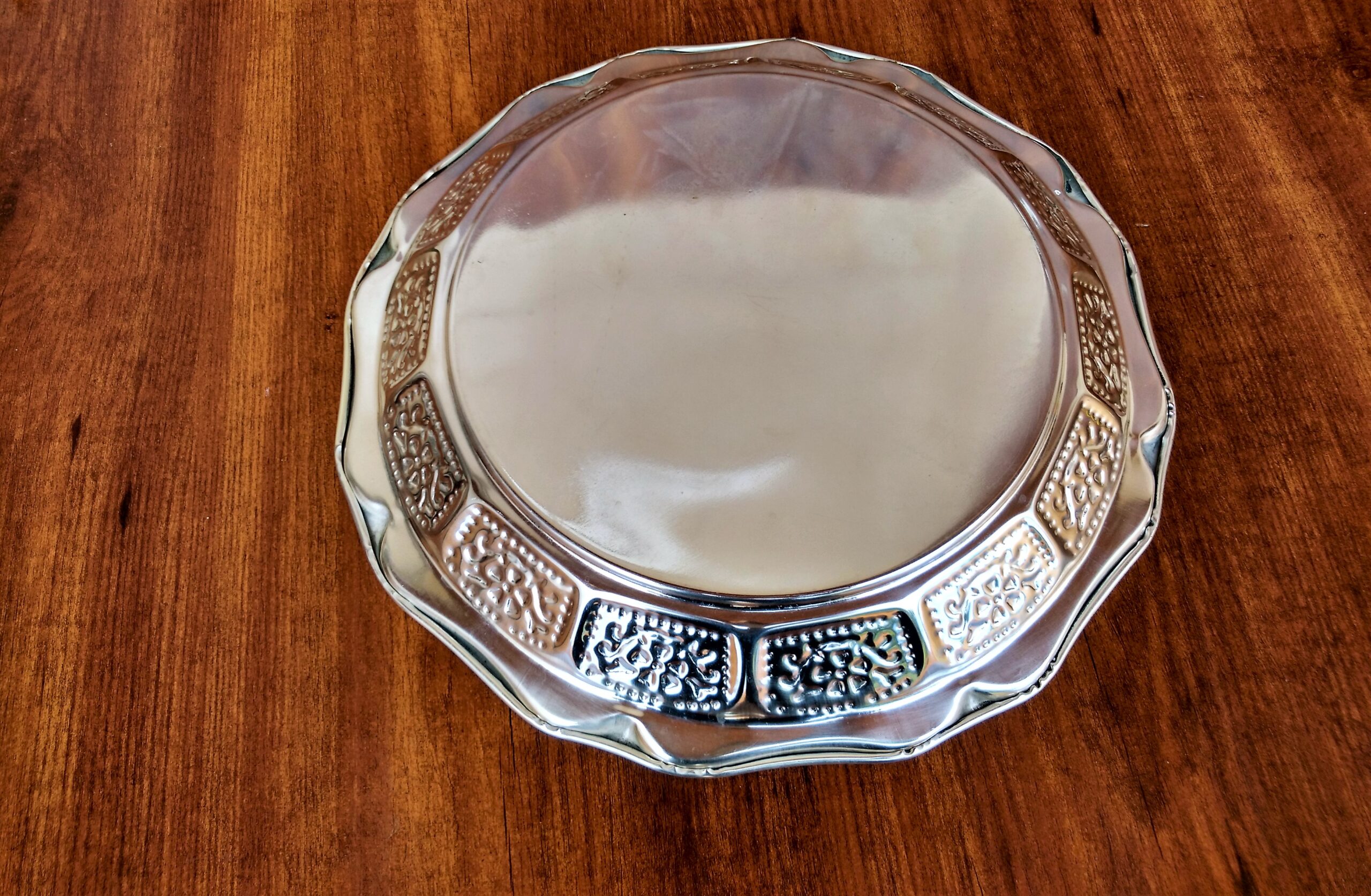 “Elevate your serving style with our exquisite silver-plated round plate, perfect for snacks, chocolates, and sweets. Its rich finish makes it a stunning addition to any event and a thoughtful gifting option.”