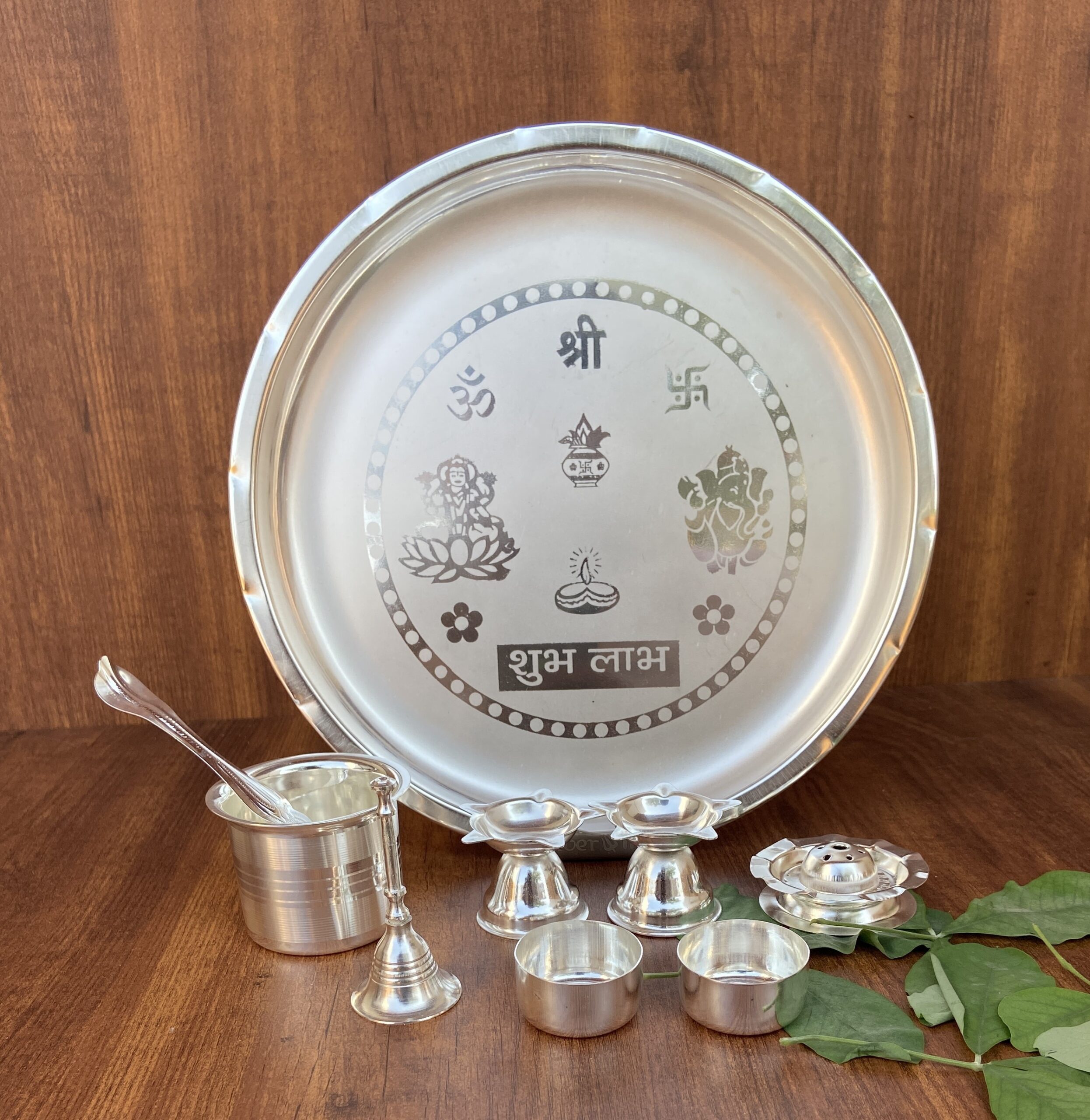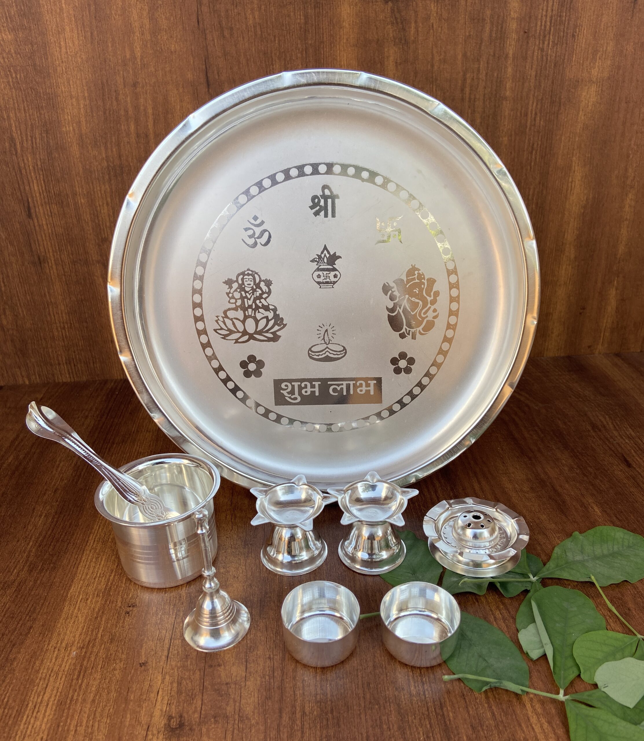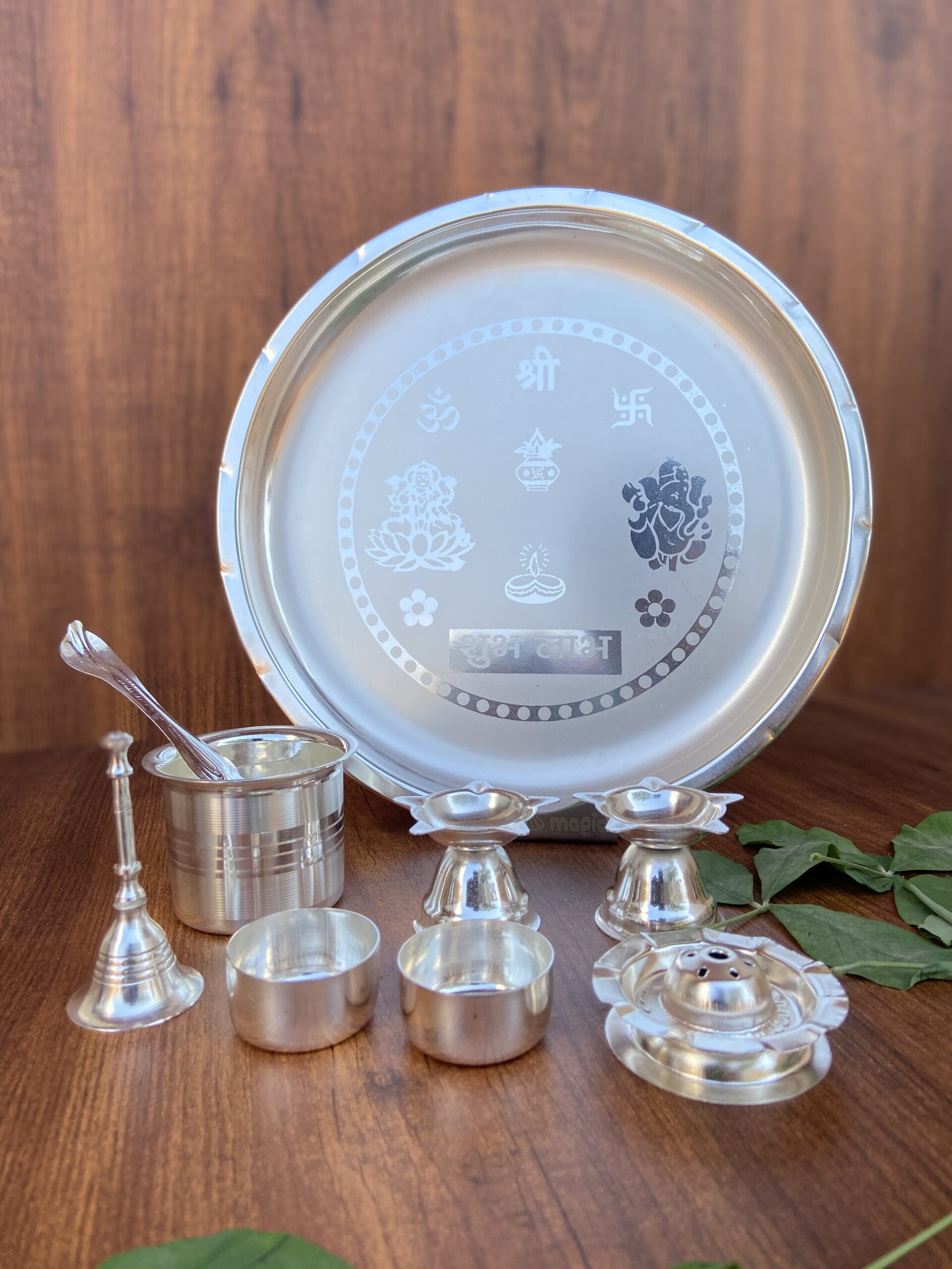 Elevate your prayer rituals with this beautifully crafted silver-plated Subh Labh pooja set. Made with utmost precision and care, this set is perfect for daily worship or special occasions.
